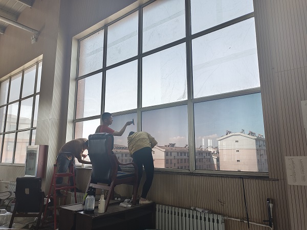 在使用过程中,工作人员发现二楼平台窗户全天采光时间较长,光线直射羽毛球运动区域,干扰视线,致使场馆运动体验打折扣。为进一步实现体育场馆更加便利化、人性化、专业化,社区党委使用党组织办实事资金实施环境改造,对二楼平台所有窗户的玻璃进行了遮光膜粘帖,遮光膜可以隔热、防紫外线、防刺目眩光、增强视觉效果,消除了场馆内一些服务细节不足的问题,改善了场馆运动体验的功能性。