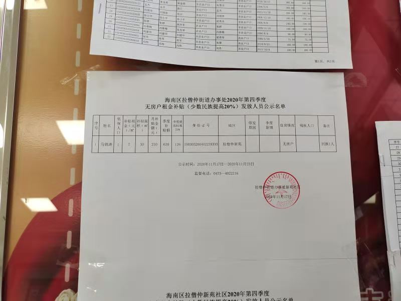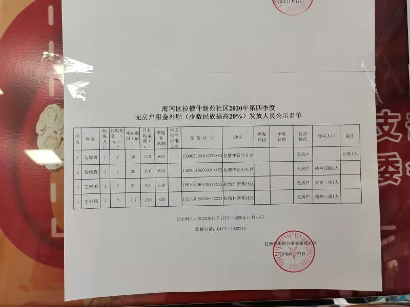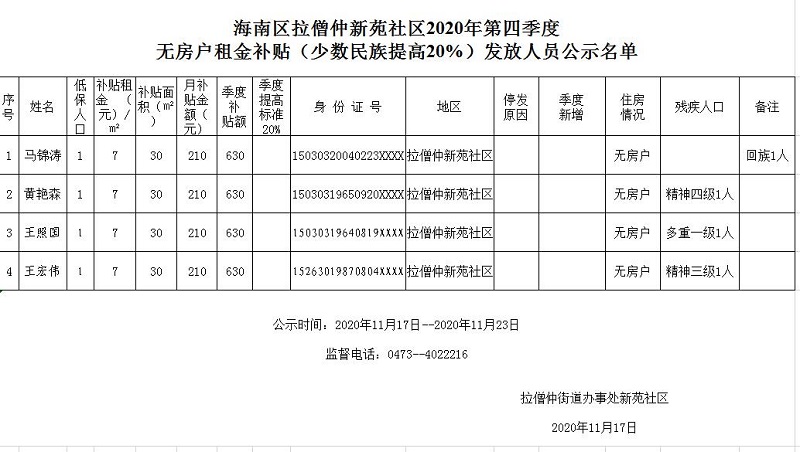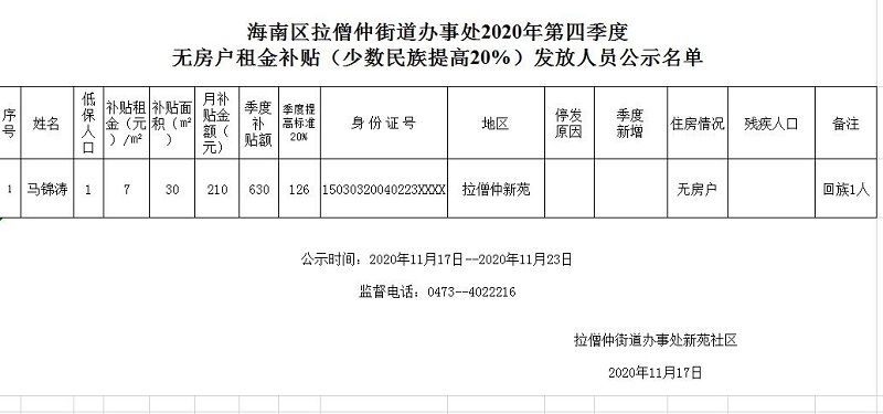 海南区拉僧仲街道办事处2020年第四季度 无房户租金补贴(少数民族提高20%)发放人员公示名单