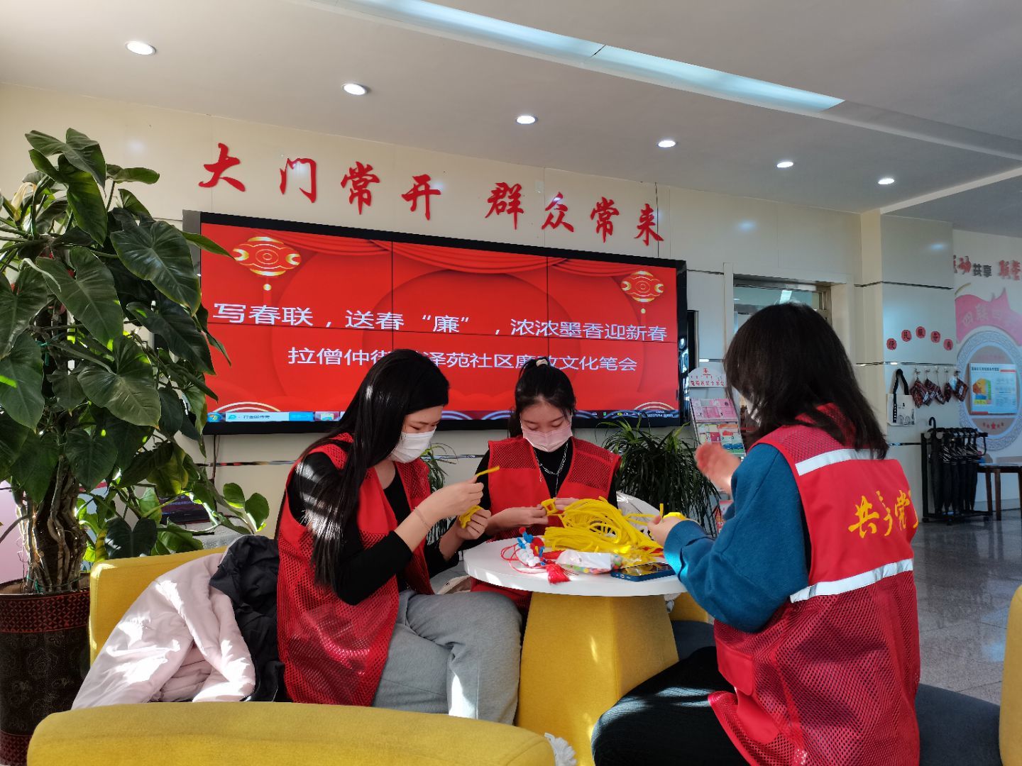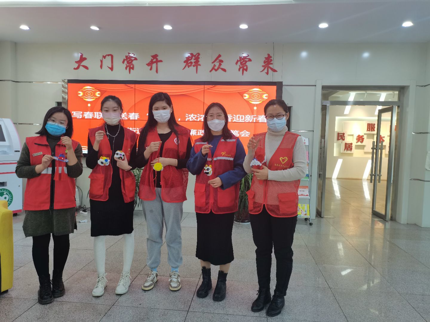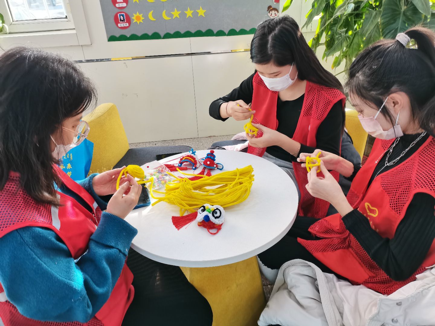 活动场地的另一边,是返乡大学生志愿者,他们早早的便等候在社区外,测温、消毒,一系列疫情防控流程结束后,积极参与到年味手工制作活动中。彩色的扭扭棒在志愿者的手里变换着不同形态,不一会一个个生动的醒狮挂件展现在眼前。巧媳妇志愿服务队也参与到手工制作中,她们绘制着年味十足的面具、制作着红彤彤的蝴蝶结,为社区喜添年味儿。