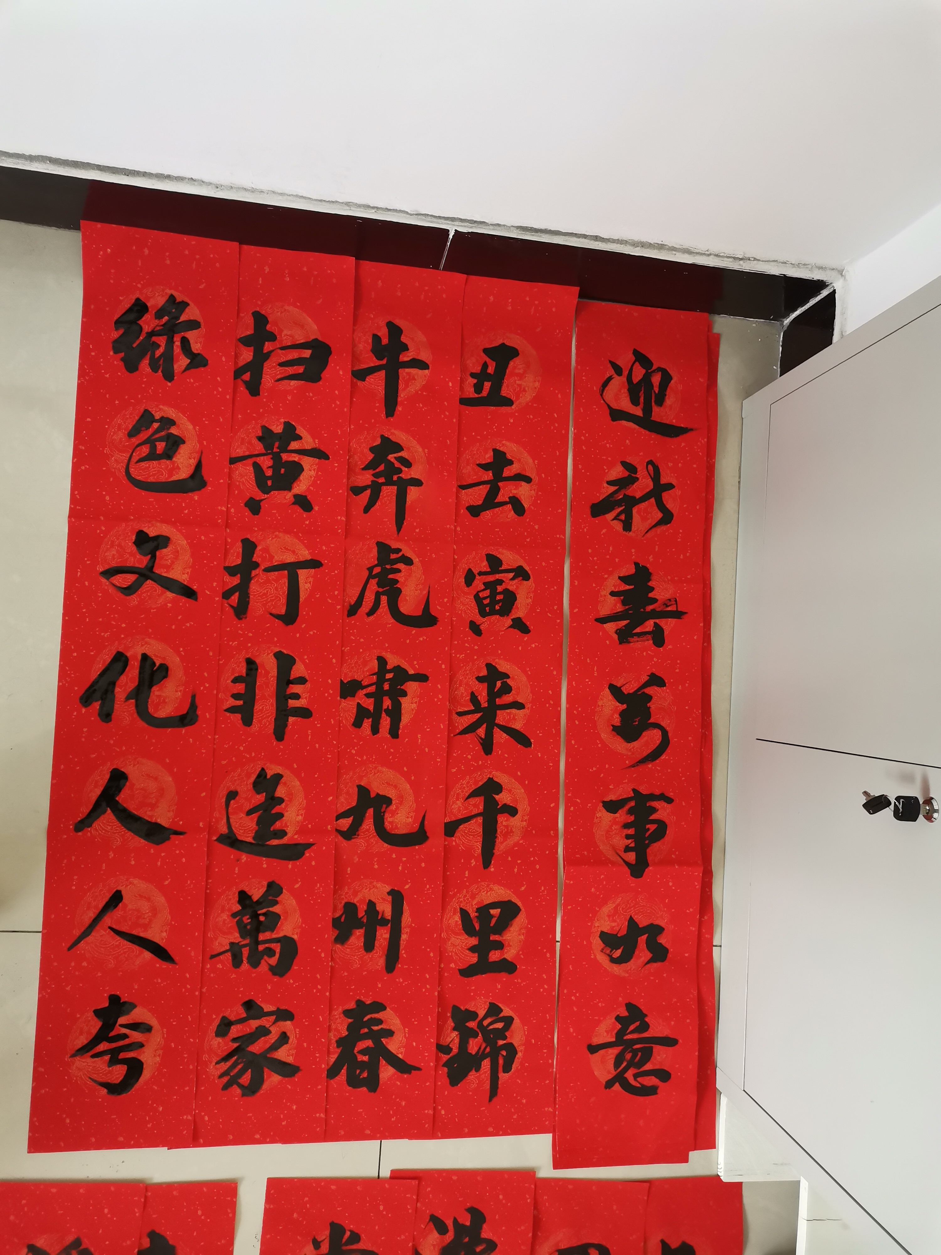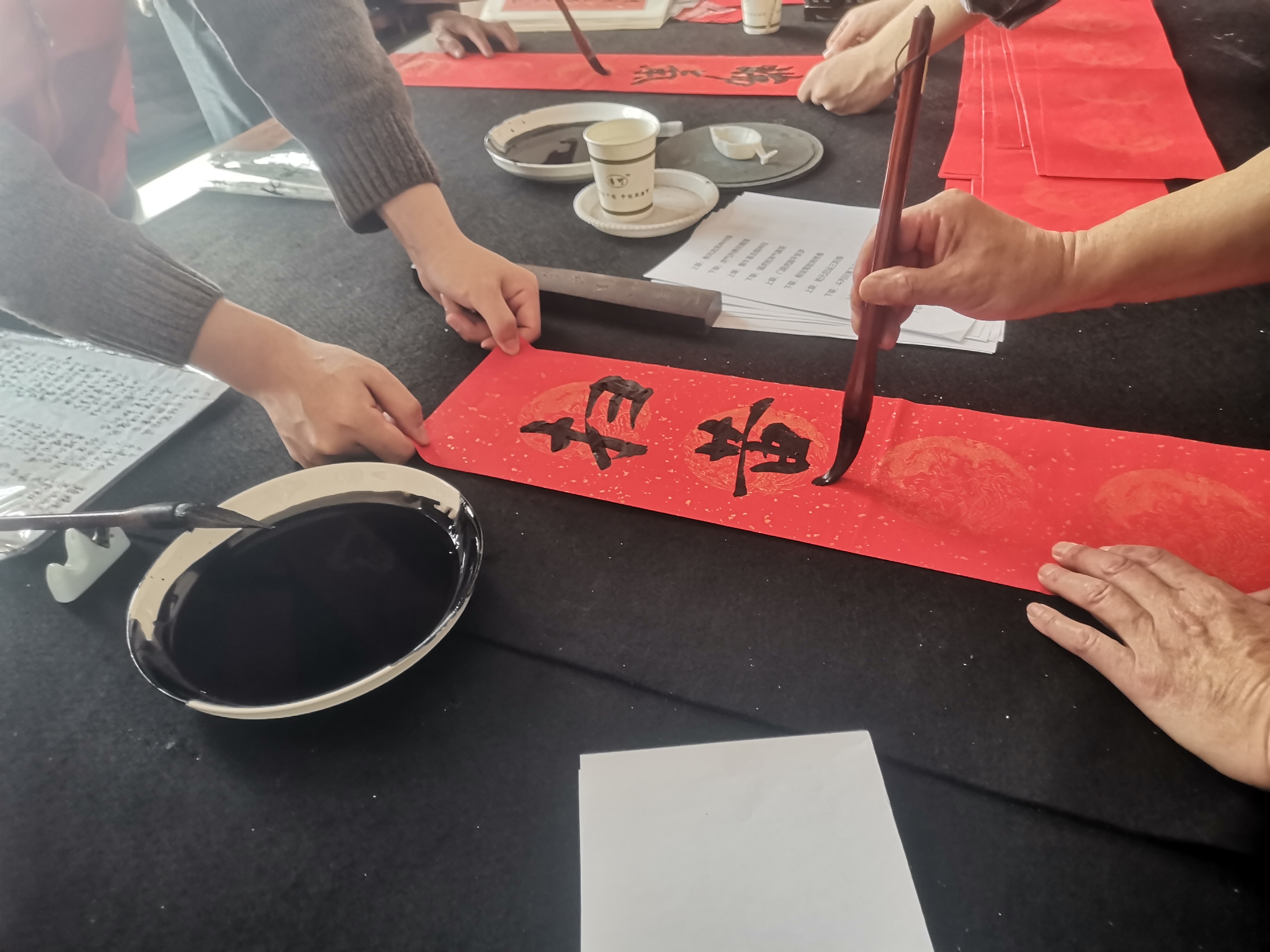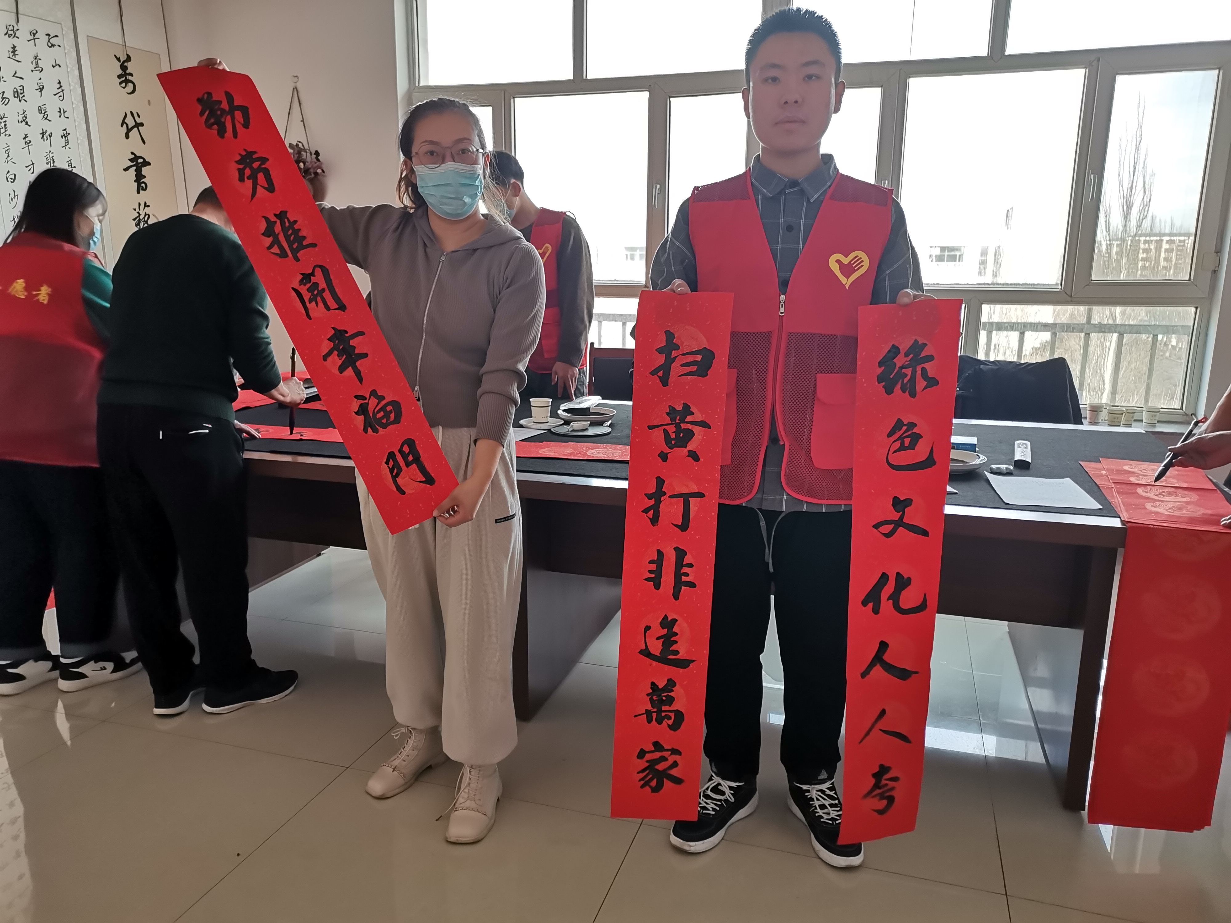 活动在泽苑社区三楼书法室举行,在活动现场热闹非凡。书写春联的老师们和小朋友们,从上午9点开始,连续挥毫泼墨、笔走龙蛇,楷、隶、行、草等各种书体尽显神韵,一句句寓意吉祥的新年祝福、扫黄打非宣传春联跃然纸上,红纸洒金、翰墨飘香,一幅幅笔酣墨饱的春联作品展现在大家眼前。
