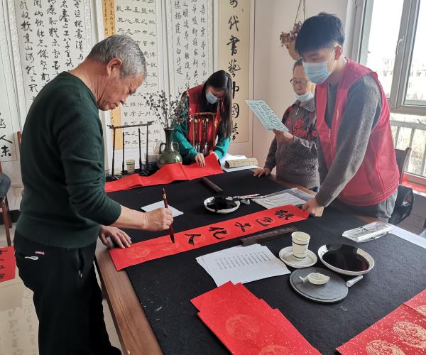社区网格员说“以前都是自己在买春联,今天来这里看到有老师和小朋友现场书写,实在是太好了,而且写春联更能彰显我国优秀传统文化,增强文化自信,显得更有年味。”