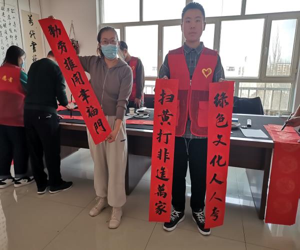 为深入开展“扫黄打非”工作,进一步加强“扫黄打非”宣传,让社区居民认清“黄”、“非”危害,切实做好文化惠民活动,丰富居民群众的文化生活,营造欢乐喜庆的节日氛围,增强文化自信。近日,泽苑社区结合“扫黄打非”宣传工作实际,组织居民开展“迎新春·写春联·送祝福”“扫黄打非”在进行活动,为居民送去新年祝福。