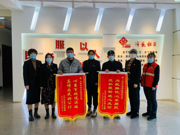12月5日一早,家住泽园西小区居民将印着“心系百姓送温暖 真情为民好公仆”、“为民排忧心系居民 无私援助爱心无价”的锦旗送到泽苑社区,向在疫情期间冲锋在前、坚守一线及长期以来帮助自己的尽心尽职尽责的社区领导及网格员表示感谢。