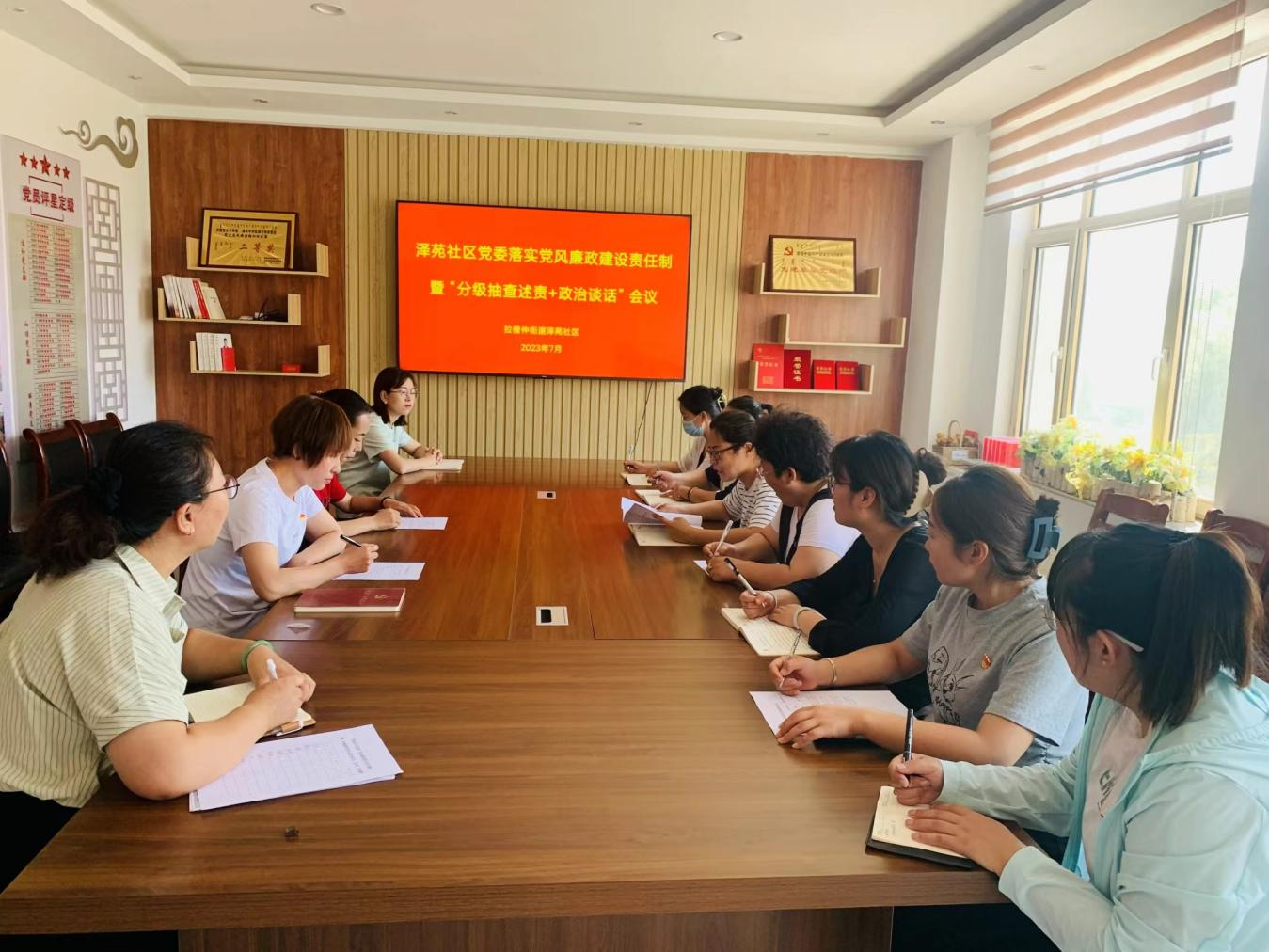 7月18日上午,泽苑社区党委在社区二楼党员活动室召开“党风廉政责任制暨‘分级抽查述责+政治谈话’”会议。会议由社区党委书记袁玲主持,社区“两委”成员和部分网格员参加会议。会上,党委书记围绕党风廉政建设工作开展情况进行了详细汇报,听取了被抽查两名党委委员的述责报告,对她们的个人述责情况进行了点评。随后对社区“两委”成员进行了集体政治谈话,被抽查两名同志围绕政治谈话内容,依次进行表态发言。
