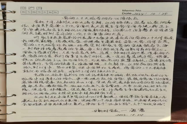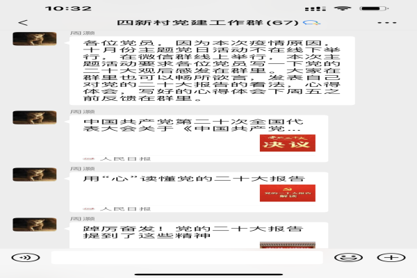 由于疫情防控下,为了让党员干部及群众,更好地学习党的二十大精神,10月24日,四新村党总支组织开展线上学习方式,由四新村党总支副书记周灏,将学习内容与大家分享,所有党员采取在家学习模式,做好笔记,分享学习观后感及经验。要原原本本学习党的二十大报告、新修改的党章、十九届中央纪委工作报告、习近平总书记在党的二十大上有关重要讲话等文件,坚持学原文、悟原理,领会党的二十大精神的丰富内涵和精神实质。