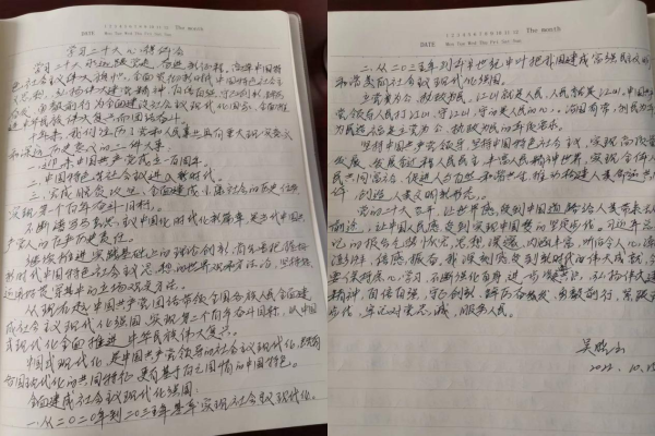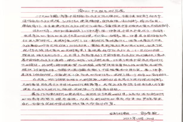党员李文花同志在感想中这样说道:“作为基层党员干部,要不断增强‘四个意识’、坚定‘四个自信’、做到‘两个维护’,要把学习贯彻党的二十大精神作为当前一个时期首要政治任务,努力钻研,开拓创新,进一步锤炼实干作风,更好地为群众谋福利。”
