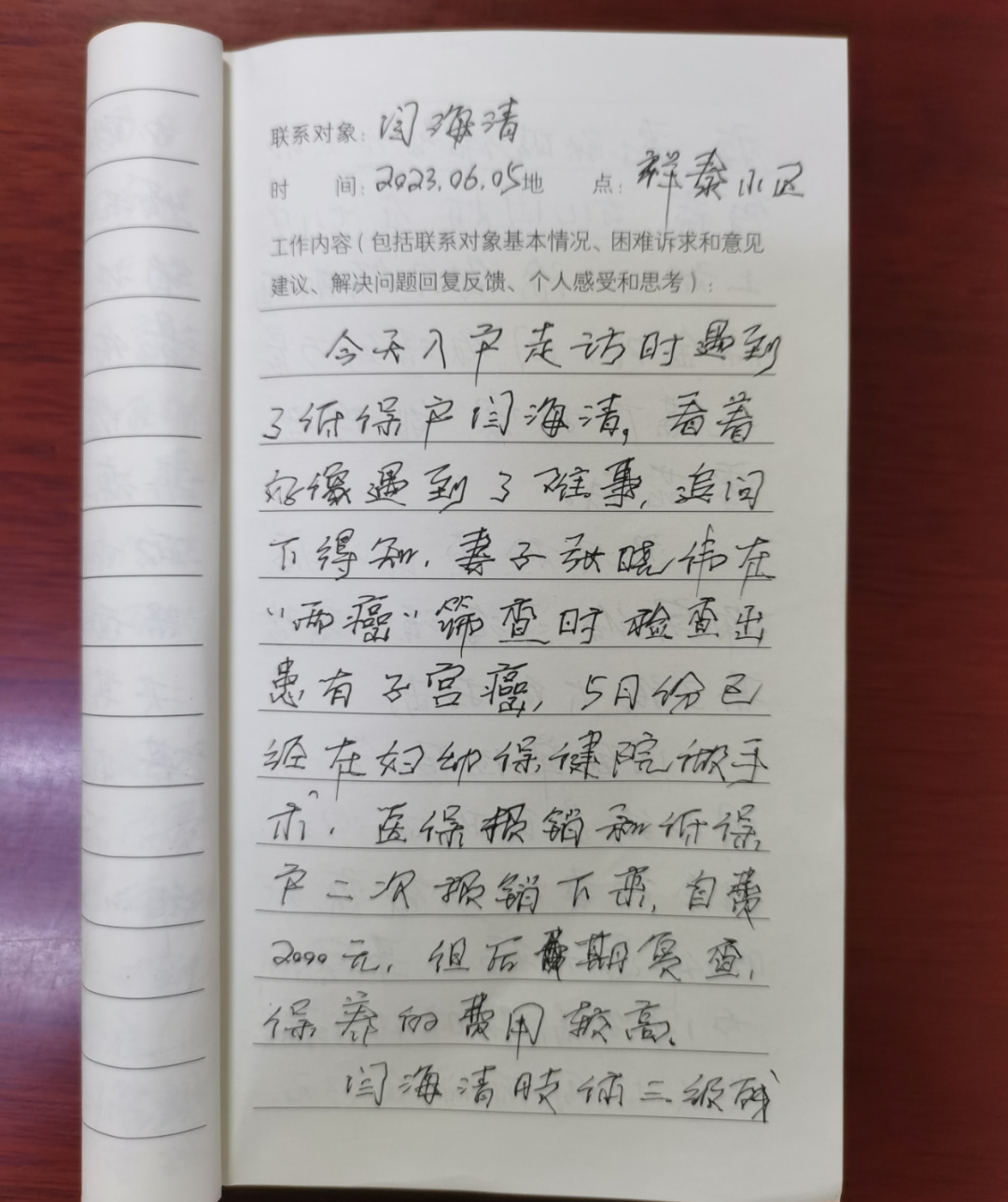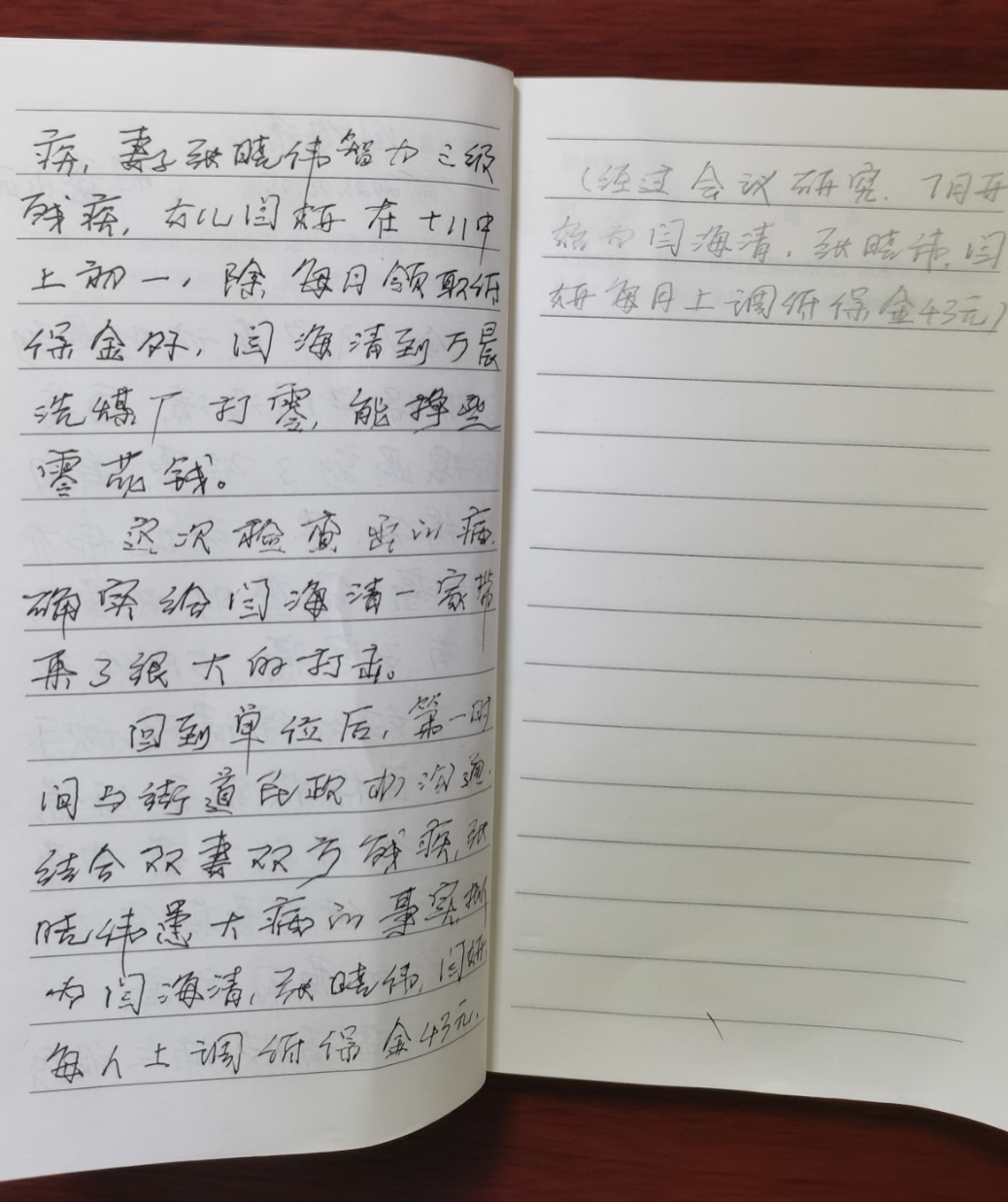 在实地走访中,社区“两委”成员王丙臣了解到辖区低保户张晓伟和丈夫都身患残疾,收入微薄,目前女儿上中学,收入低,家庭困难。王丙臣在了解情况后及时将他们的困难记录在“小本本”上,并及时上报街道办事处民政办。通过民主评议和合理计算后,为张晓伟家庭调增了月低保金发放标准。