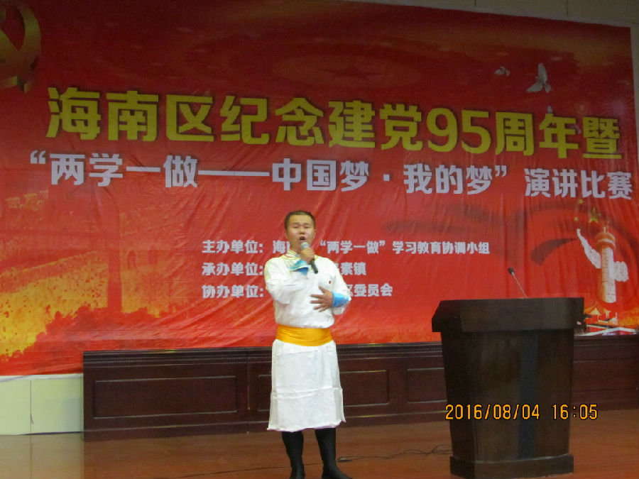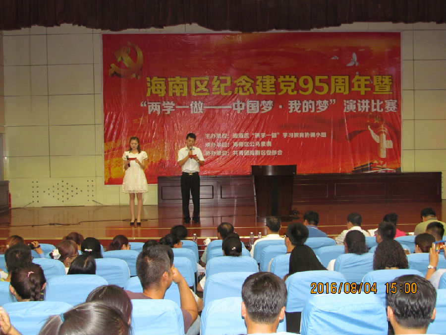 8月4日,海南区举办纪念建党95周年暨 “两学一做——中国梦·我的梦”演讲比赛。本次比赛是我区纪念中国共产党成立95周年系列活动之一,由区“两学一做”学习教育协调小组主办、公乌素镇承办、共青团海南区委员会协办,来自全区教育、公安、企业、社区等党组织的14名精英选手参加了这次比赛。