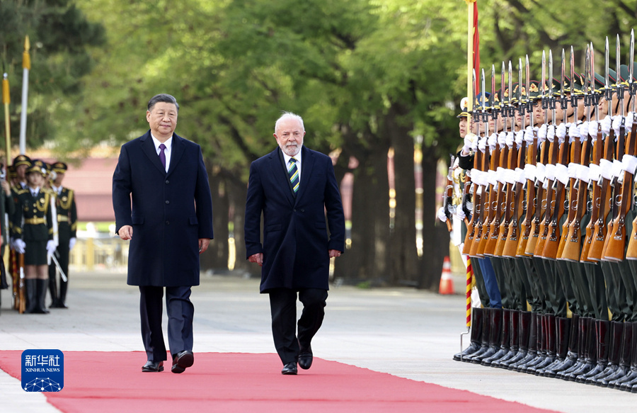4月14日下午,国家主席习近平在北京人民大会堂同来华进行国事访问的巴西总统卢拉举行会谈。这是会谈前,习近平在人民大会堂东门外广场为卢拉举行欢迎仪式。 新华社记者 黄敬文 摄