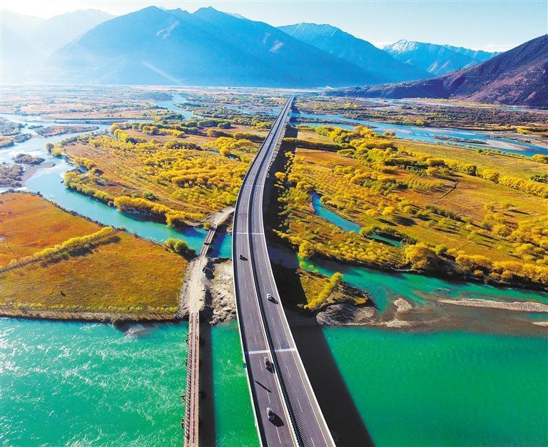 俯瞰穿越雅尼国家湿地公园的最美景观大道——西藏林芝米林机场高等级公路。林芝市持续加大雅尼国家湿地公园的保护力度,扎实推进基础设施与旅游项目建设。 扎洛摄 (中经视觉)