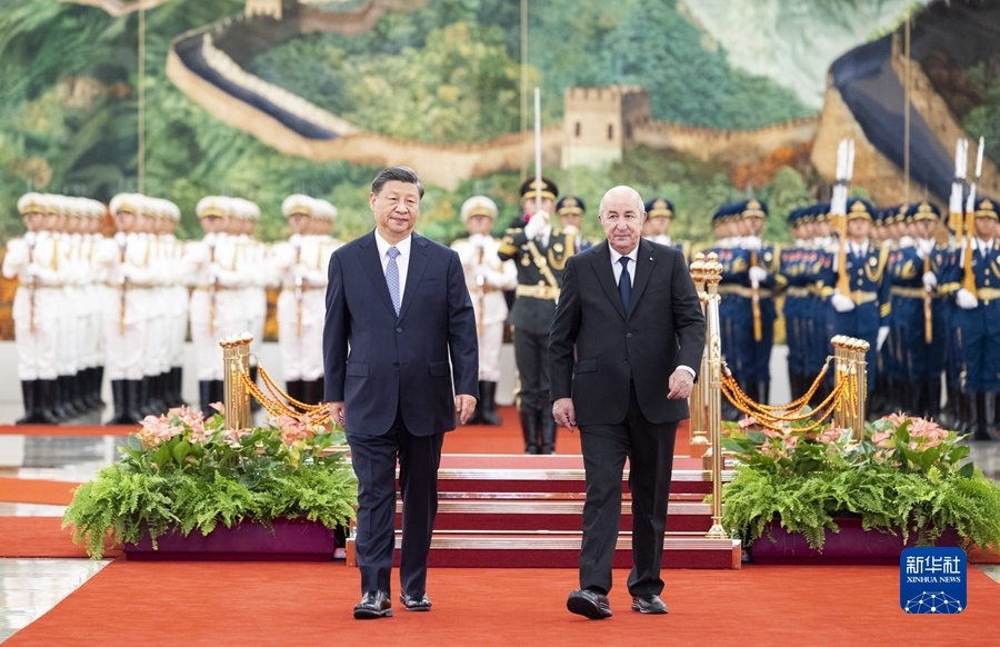 7月18日下午,国家主席习近平在北京人民大会堂同来华进行国事访问的阿尔及利亚总统特本举行会谈。这是会谈前,习近平在人民大会堂北大厅为特本举行欢迎仪式。新华社记者 翟健岚 摄