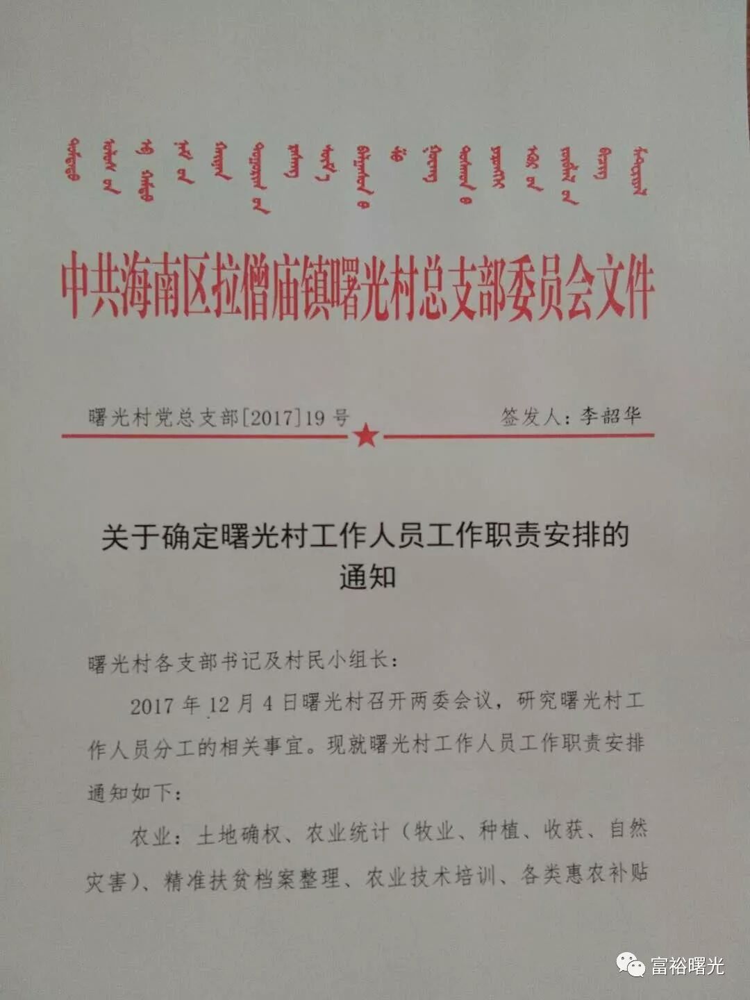 关于确定曙光村工作人员工作职责安排的通知