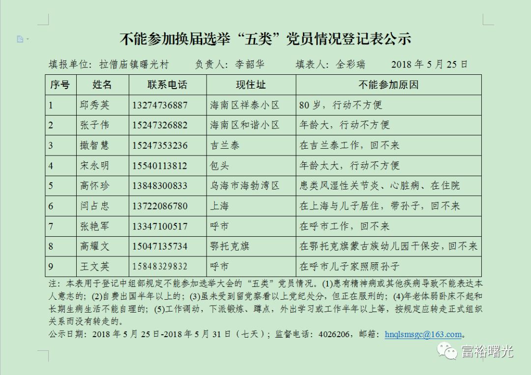 不能参加换届选举“五类”党员情况登记表公示