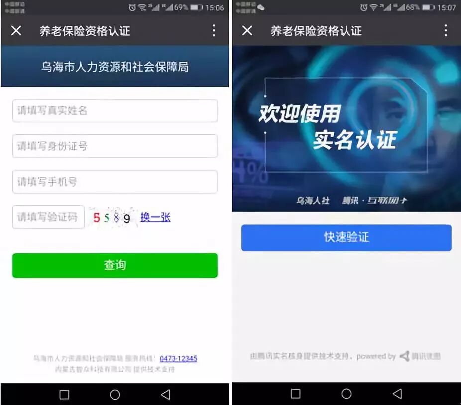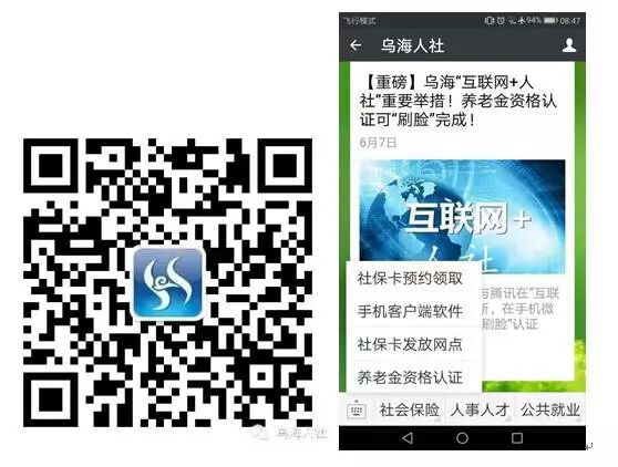 方法一、长按或扫描下方二维码,关注“乌海人社”,或者在微信“通讯录”功能下点击“公众号”通过右上角的“+”号搜索“乌海人社”并关注。打开“乌海人社”公众号点击左下角“社会保险”,选择“养老金资格认证”。