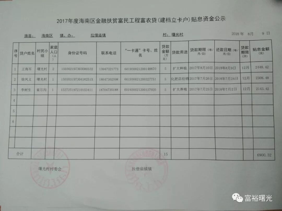 2017年度海南区金融扶贫富民工程富农贷(建档立卡户)贴息资金公示