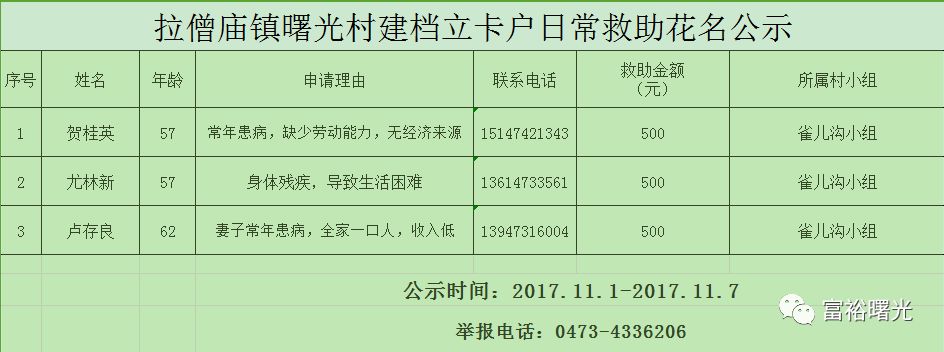 拉僧庙镇曙光村建档立卡户日常救助花名公示