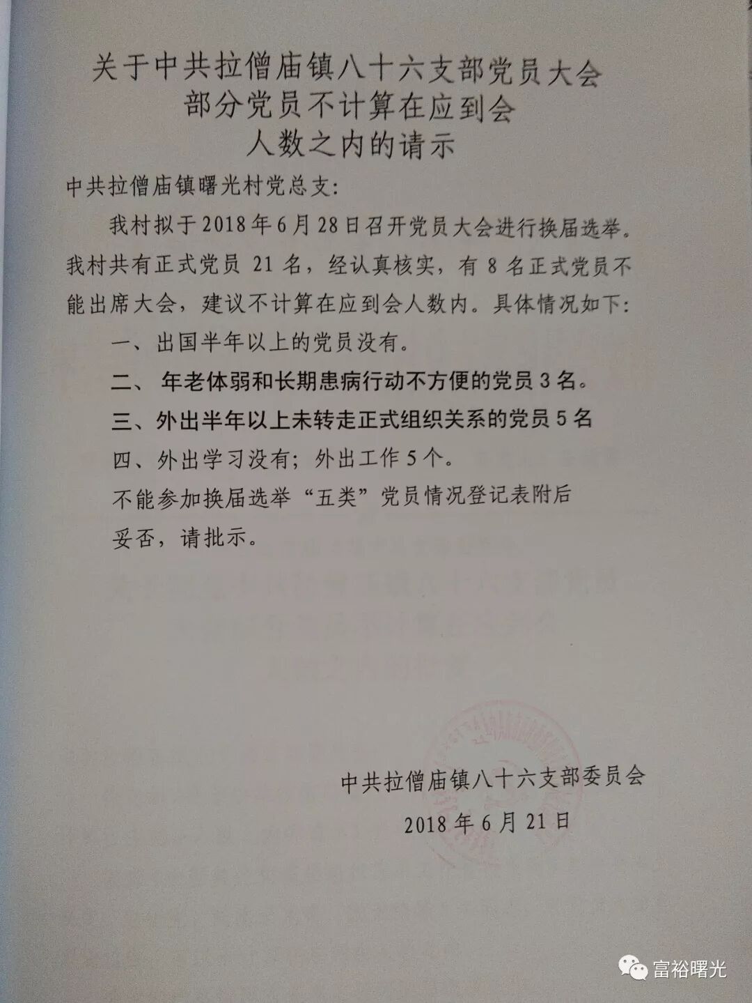 关于中共拉僧庙镇八十六处支部党员大会部分党员不计算在应到会人数之内的请示