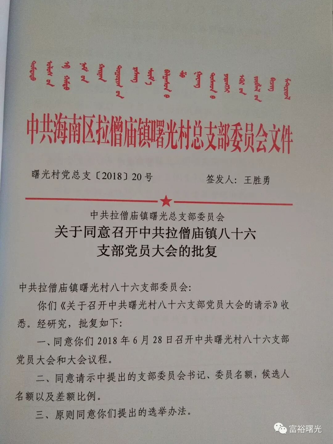关于同意召开中共拉僧庙镇曙光支部党员大会的批复