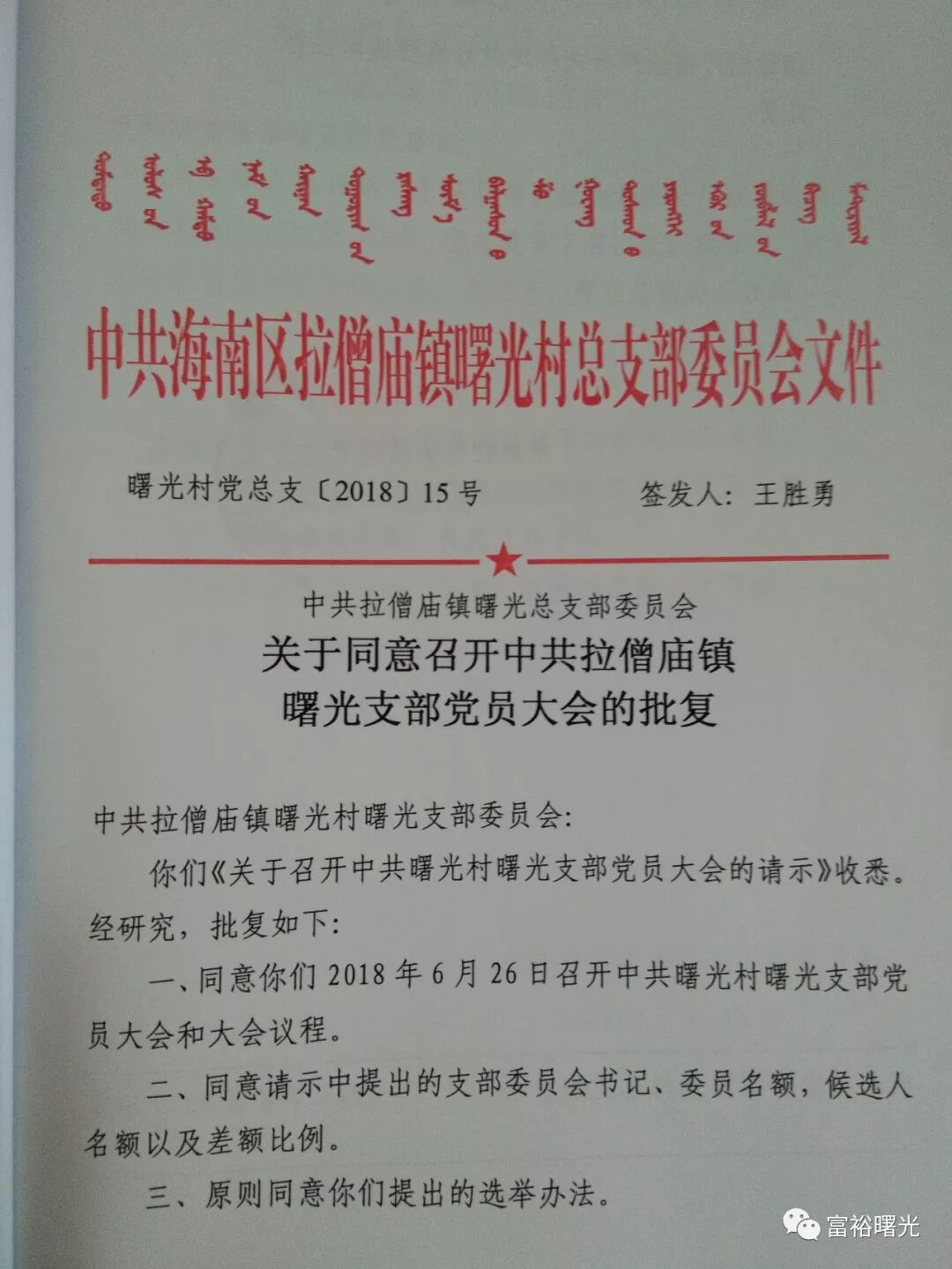 关于同意召开中共拉僧庙镇曙光支部党员大会的批复