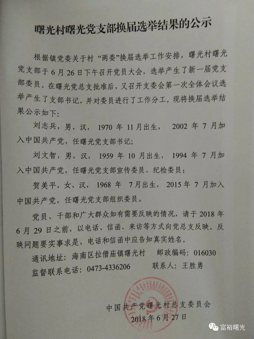 曙光村曙光党支部换届选举结果的公示