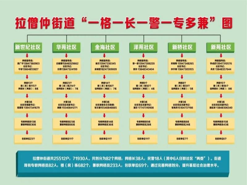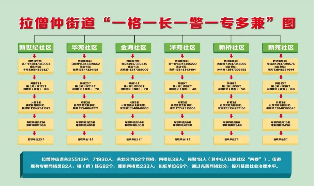 拉僧仲街道根据辖区特点按照“相对集中,便于管理”的原则,将辖区划分为82个网格,并按照“支部建在网格上”的要求,形成“居民党支部—楼栋党小组—党员中心户”的小区党建网格局。并不断抓好网格队伍管理,建立《拉僧仲街道办事处专职网格员管理考核办法》,健全“一格一长一警一专多兼”的全科网格化队伍建设体系以及运行机制,明确其在网格内的八大项职能职责,使网格员达到“眼明、言正、手勤”的工作目标。