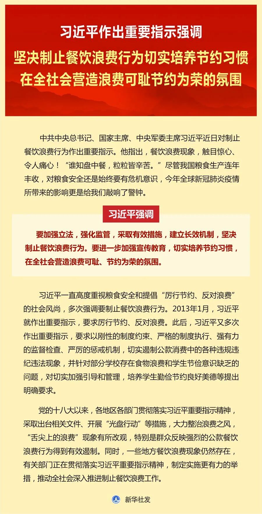 习近平强调,要加强立法,强化监管,采取有效措施,建立长效机制,坚决制止餐饮浪费行为。要进一步加强宣传教育,切实培养节约习惯,在全社会营造浪费可耻、节约为荣的氛围。