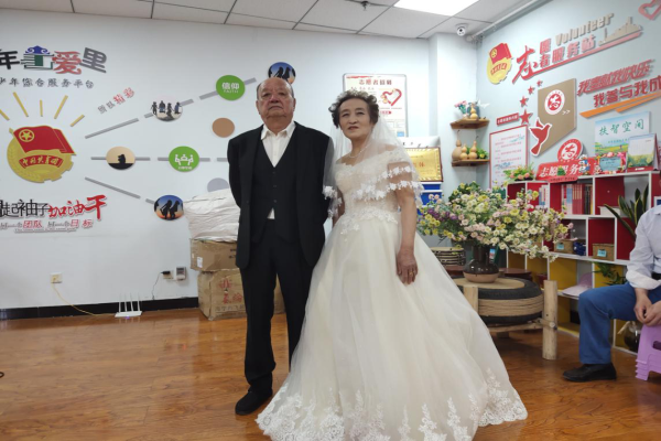 执子之手,与子偕老,一对对伉俪情深的夫妻,满怀期待地走进临时化妆间,挑选婚纱、礼服,郑重其事地等待着婚纱照的拍摄。拍摄中,身着笔直西装、穿着白色婚纱裙、红色秀禾服的老人们高兴得像盛开的花朵,在摄像师的指导下,精神抖擞、意气风发地摆着各种姿势,“幸福”“感动”“甜蜜”的笑容一一定格。社区老年人纷纷表示,这次拍摄婚纱照是给自己的一份珍贵的礼物,将会永远珍藏着。拍摄完成后,为每对老人赠送精美小礼物。