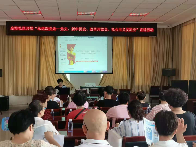 7月22日,金海社区开展“永远跟党走——党史、新中国史、改革开放史、社会主义展史”宣讲活动,金海社区党员、居民共20人参加活动。