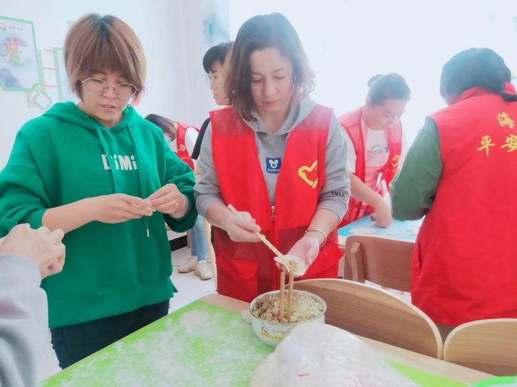 此次活动分工明确,包水饺的志愿者们分工明确,和面的、切菜的、擀皮的、包饺子的,有序进行。