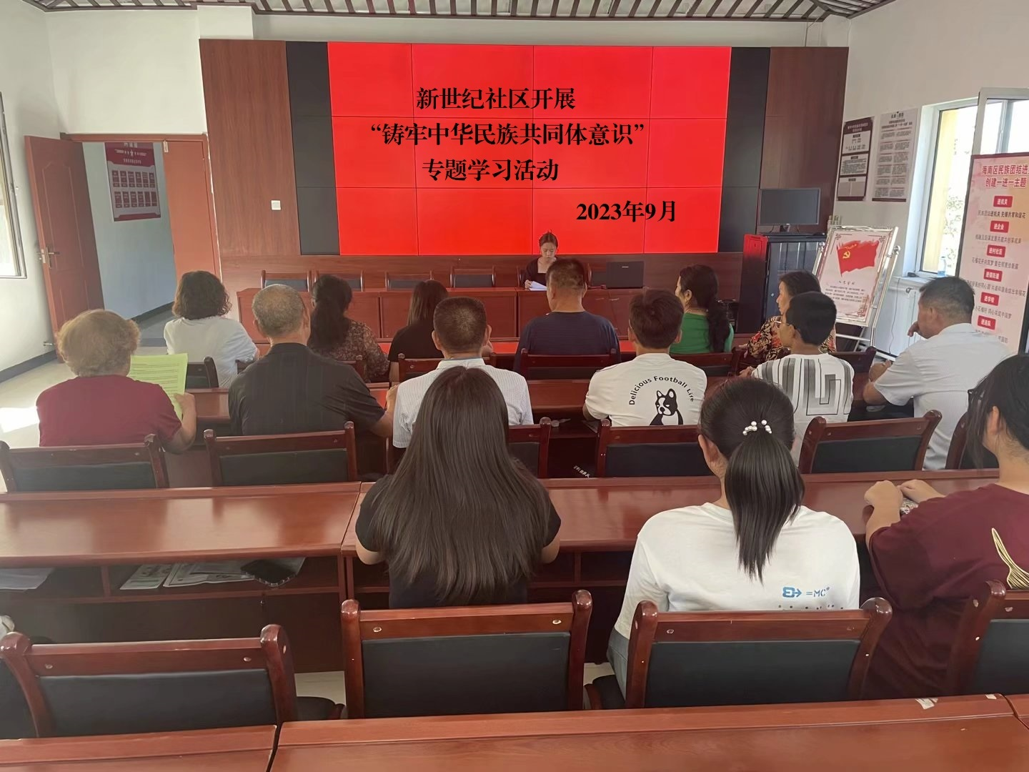 新世纪社区组织两委成员和网格员,在社区中华优秀文化大讲堂内开展铸牢中华民族共同体意识专题学习活动。学习会上,重点学习“习近平总书记关于加强和改进民族工作的重要思想”、“感恩奋进跟党走,全方位建设模范自治区”等内容。强调了学习落实党的民族理论和路线方针政策,是当前社区基层工作的首要政治任务,要将理论学习充分运用到工作实践中,促进辖区各族群众广泛交往交流交融,进一步铸牢中华民族共同体意识。