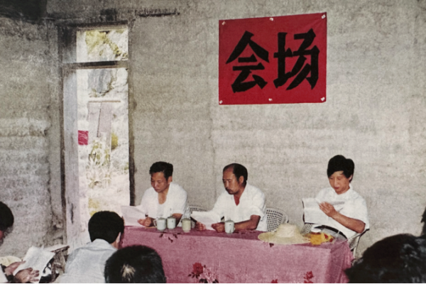 1989年7月,习近平(右一)在下党乡召开现场办公会。应他要求,乡党委书记杨奕周坐在中间。