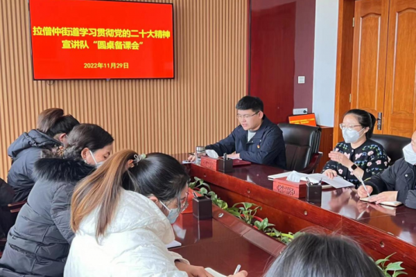 11月29日下午,拉僧仲街道学习宣传贯彻党的二十大精神理论学习“轻骑兵”宣讲队召开“圆桌备课会”。街道青年宣讲队成员、各社区理论学习“轻骑兵”宣讲队员参加会议。